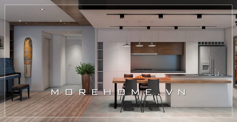 Bộ bàn ăn hiện đại, gọn gàng tiện lợi là lựa chọn hoàn hảo cho phòng ăn liền phòng bếp của không gian căn hộ chung cư.