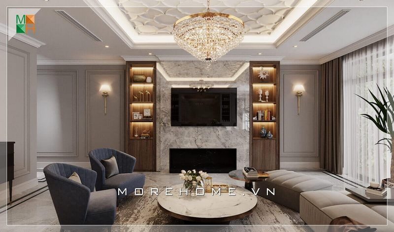 Căn hộ chung cư sang trọng cao cấp với bộ sofa bọc nỉ sang trọng thiết kế phóng khoáng rộng rãi. Bộ sofa tone màu hài hòa với sàn nhà được thiết kế sang trọng và cao cấp tạo nên điểm nhấn ấn tượng của phong cách thiết kế phòng khách cổ điển hài hoà và kiến tạo không gian phòng khách lịch sự.