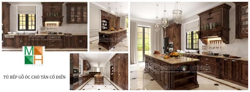 Mẫu thiết kế tủ bếp gỗ óc chó tân cổ điển mới nhất, có tính thẩm mỹ cao, họa tiết đơn giản nhẹ nhàng, phù hợp với biệt thự, căn hộ cao cấp tân cổ điển.