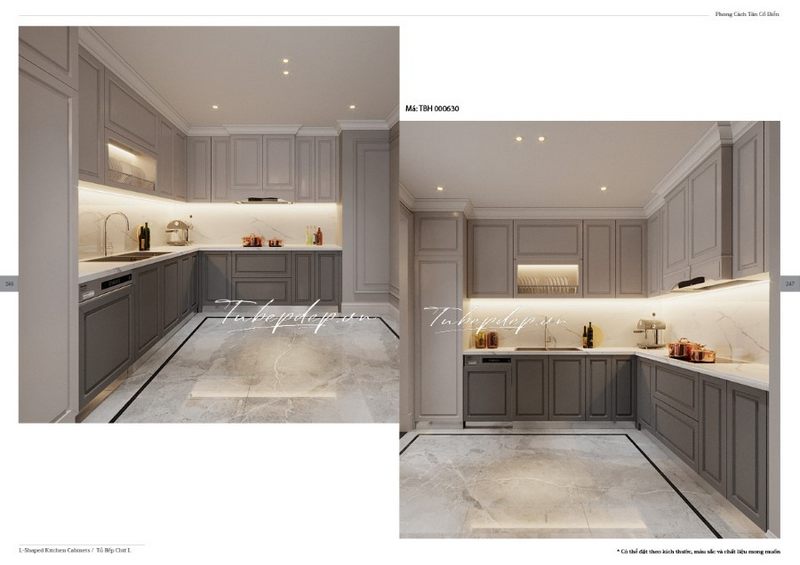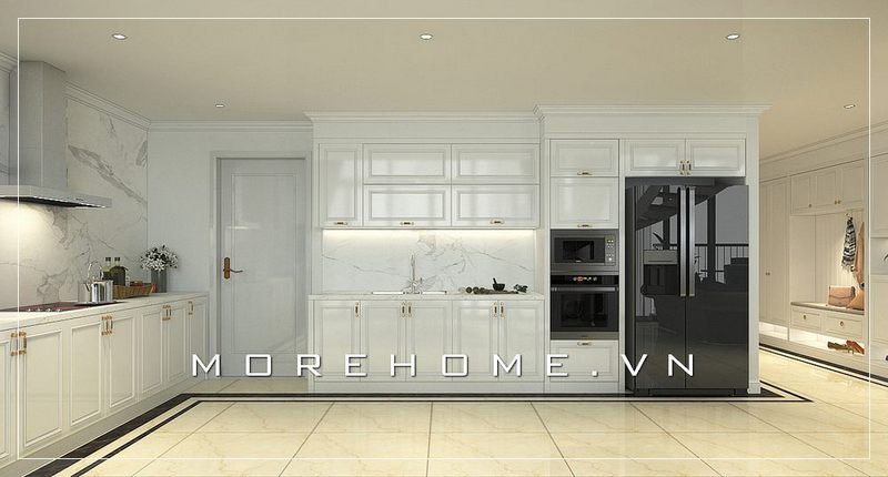 Đem đến cho không gian một vẻ đẹp nhã nhặn, tinh tế với hệ thống tủ bếp màu trắng - xám nhạt, thiết kế hài hòa kiểu tân cổ điển cách tân phù hợp với nhịp sống ngày nay