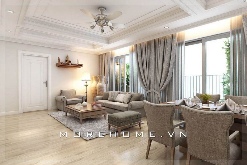 Mẫu thiết kế nội thất chung cư tân cổ điển đẹp với tông màu chủ đạo xám nhã nhặn kết hợp nội thất gỗ tự nhiên cao cấp