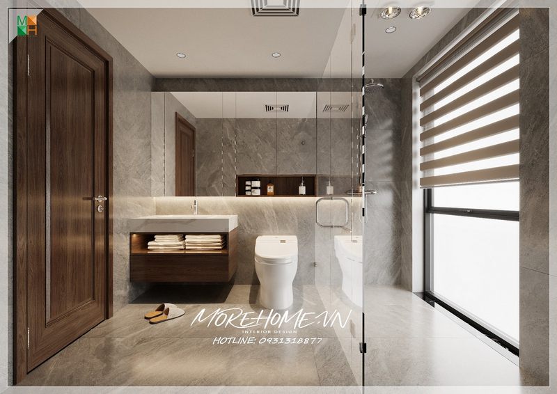 Mặt đá ốp tường và gạch lát nền được lựa chọn cùng màu để tạo nên một giao diện đồng đều và chặt chẽ, giúp đạt được hiệu quả cao cho phòng tắm.